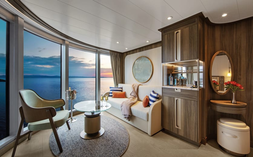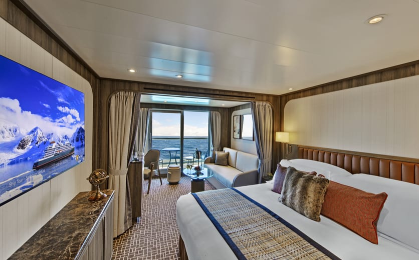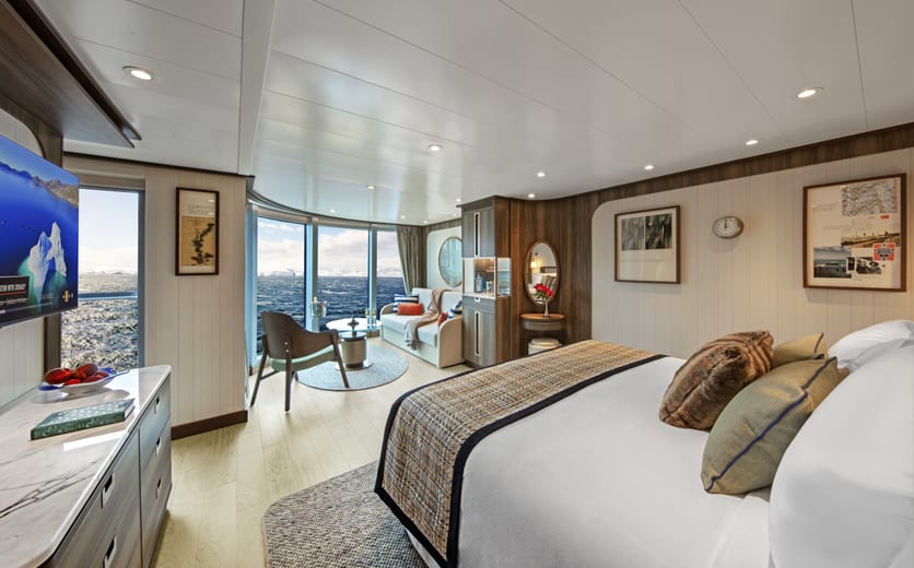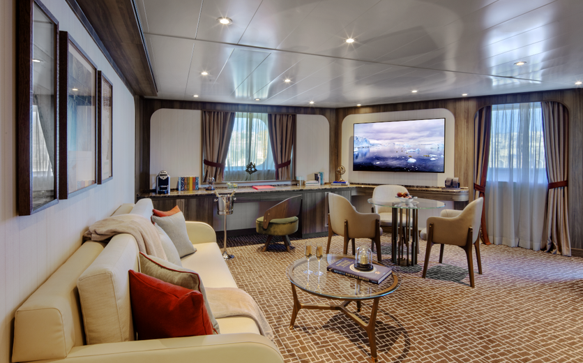 Owner's Suites on Seabourn Venture feature a comfortable living area; private veranda; queen-size bed or two twin beds; extra-large walk-in closet for expedition gear; personal safe; interactive flat-screen TV with music and movies; fully stocked bar and refrigerator; writing desk with personalised stationery; makeup vanity; spacious bathroom with double vanities, tub and shower, plush robes, slippers, hairdryer and 110/220V AC outlets.