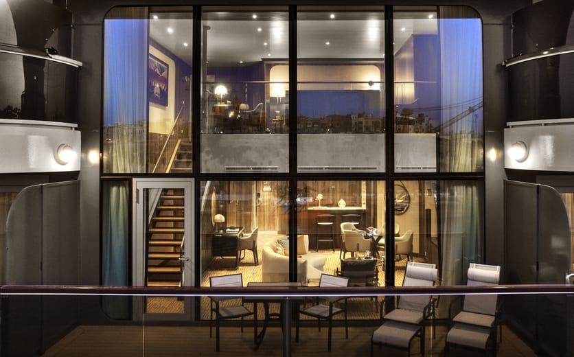 Expansive apartment-style suite stretching over two decks located midship. Entry opens to seamless double height views and generous lower level living area large enough for entertaining with a dining table for four, separate guest bath and pantry with wet bar stocked with a customised selection of spirits. Sculptured staircase leading to upper level and the master bedroom with a queen-sized Duxiana Axion 15 adjustable high-performance sleep system facing expansive windows, a wall of closets along with advanced technology including a roll-up LG OLED TV. Separate walk-in closet adjacent to the five-piece bathroom complete with a whirlpool spa tub and separate shower. Wintergarden suite guests also enjoy wildlife and vista spotting using a Swarovski ATX Interior spotting scope. The tripod-mounted scope, with its 25-60x85 lens capability, is for use in-suite while onboard. Entertainment experience features a high-end Bang & Olufsen Beolab 5 speaker system and Bang & Olufsen H4 Bluetooth headphones for guest use onboard.