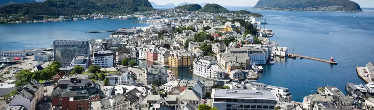 The coastal town of Ålesund is the commercial capital of the Møre og Romsdal district. But more important, it is noted for its characteristic Jugendstil (Art Nouveau) buildings, which some claim make Ålesund one of the most beautiful towns in Norway. This Art Nouveau style emerged when the town was completely rebuilt after a devastating fire in 1904 destroyed nearly 800 buildings and left 10,000 residents homeless. It is said that the fire started by a tipped oil lamp. Rebuilding was carried out with the help of many young, foreign architects who added their own flourishes to the architectural blend of German Jugendstil and Viking roots. Today, narrow streets are crammed with buildings topped with turrets, spires and gables that bear decorations of dragonheads and curlicues. As one of the few remaining Art Nouveau towns in the world, in 1998 Ålesund was awarded the coveted Houens National Memorial Prize for the preservation of its unique architecture.