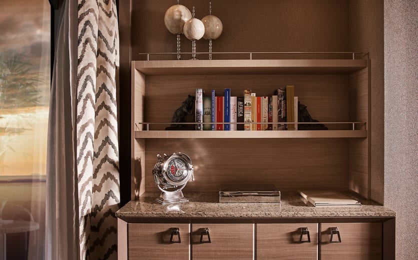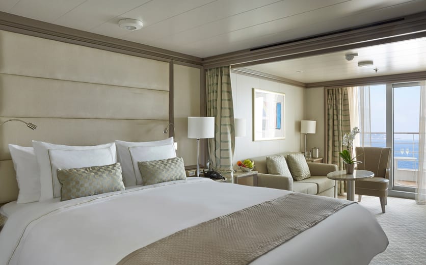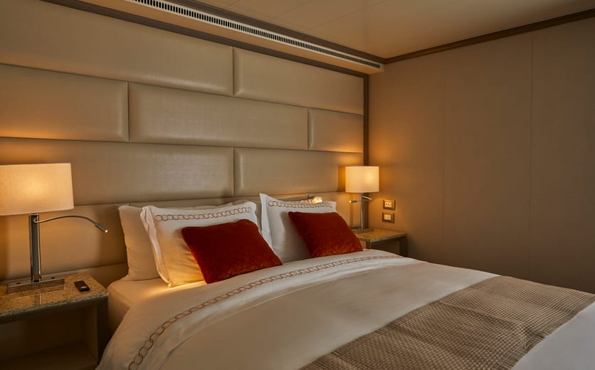Picture yourself taking a delicious breakfast on your private veranda. Imagine watching the sun set, a flute of chilled champagne in hand, setting sail for your next destination. Prestigious, classic and sophisticated, this stylish apartment suite offers the ultimate in finest accommodation on board. Set aside for those who seek a superlative level of space, comfort and service, the Owner’s Suite has it all. The adjoining bedroom, with its en-suite bathroom, offers its own spectacular sea views.