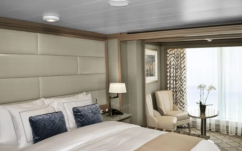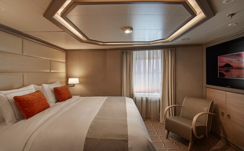 Located on the upper deck, and offering spectacular sunset views, the Superior Veranda Suite has all the comforts and luxury that you can expect aboard. A comfortable living space, attention to detail and a generous expanse of amenities, this stunning suite makes for a cosy home while on the seas. But perhaps this suite’s finest asset lies just outside, as floor-to-ceiling glass doors open onto a private veranda, making every sunset feel as if it is yours alone.