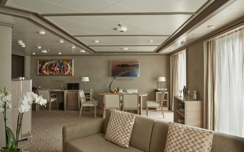 Designed with the values of the culture of living in mind, the Royal Suite offers a vast, eloquent space. Precise lines, authentic Italian craftsmanship and fine materials make up just some of the details of this stunning suite. Commanding and majestic, the Royal Suite boasts a lavish living area perfect for entertaining, plush interior furnishings and sweeping seascapes from the private terrace. The comfort of the spacious apartment makes this the ideal space for those wanting to feel the true comfort and luxury of the Silversea philosophy.
