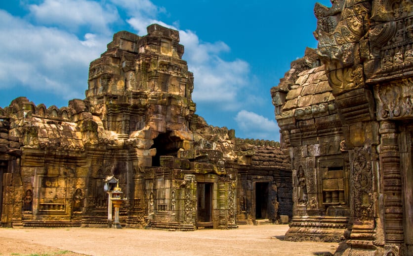 ANGKOR BAN – KAMPONG CHAM. Go on a walking tour of Angkor Ban, one of the few villages in Cambodia that was not destroyed under the Khmer Rouge regime in the 1970s. Here people still live in their traditional wooden abodes and keep their old cultural traditions alive. Hundreds of wooden houses stand intact on stilts, shaded with banana trees, among the hustle and bustle of the daily agricultural on-going of the local villagers. After visiting here, the ship sets sail for Kampong Cham, where you will go on an afternoon excursion to Wat Nokor, perhaps the most treasured monument within the ancient complex of Banteay Prey Nokor. Fusing the Old-World with the “new,” this centuries-old temple now boasts a contemporary pagoda within its walls, delighting guests with colorful depictions of the Buddha’s life. Alternatively, visit the Twin Mountains, known as Phnom Pros and Phnom Srei (the male and female mountains). Cap the day off with a festive Farewell Dinner on board. (B,L,D)