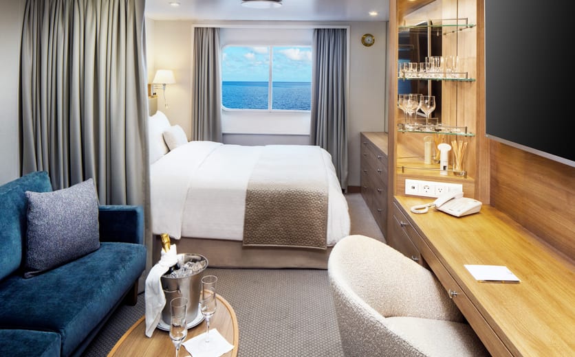 Yacht Club Deck 3 & 4 staterooms average 195 sq.ft./18.12 sq. meters. These picture window ocean view staterooms include a marble-lined bathroom in select staterooms with a multi-jet shower and a well-appointed open living area with sofa, chair, cocktail table, and built-in dresser with writing desk. Most staterooms offer a choice of 2 twin beds or 1 queen bed. Please contact the reservations team to confirm your choice. Deck 4 staterooms enjoy close proximity to the SeaDream Spa, Fitness Centre, and Library. Deck 3 is the perfect location for guests who desire to be just feet from the pool.