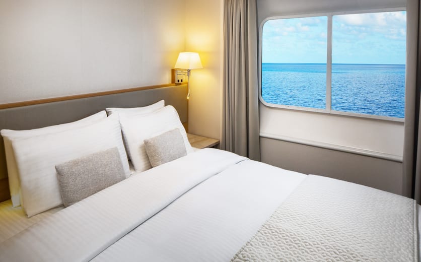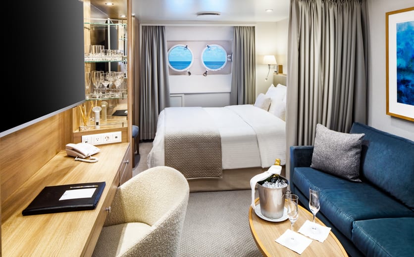 Yacht Club Deck 3 & 4 staterooms average 195 sq.ft./18.12 sq. meters. These picture window ocean view staterooms include a marble-lined bathroom in select staterooms with a multi-jet shower and a well-appointed open living area with sofa, chair, cocktail table, and built-in dresser with writing desk. Most staterooms offer a choice of 2 twin beds or 1 queen bed. Please contact the reservations team to confirm your choice. Deck 4 staterooms enjoy close proximity to the SeaDream Spa, Fitness Centre, and Library. Deck 3 is the perfect location for guests who desire to be just feet from the pool.