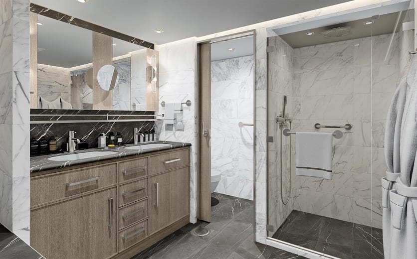 Experience the joy of sailing the world with an exquisitely designed space like this suite to call home throughout your voyage. Indulge in a sumptuous living room, two full baths, lavish bath products and a private balcony.