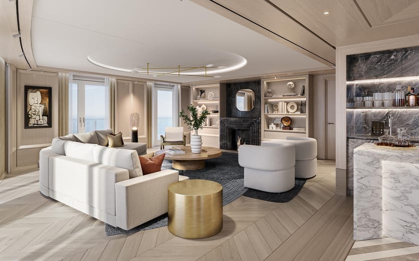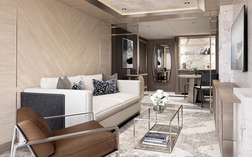 A glamorous home away from home with a private balcony that’s among the largest at sea. Luxuriate in its spacious living room and sitting area, and impress guests with a full-liquor bar and in-suite caviar service.