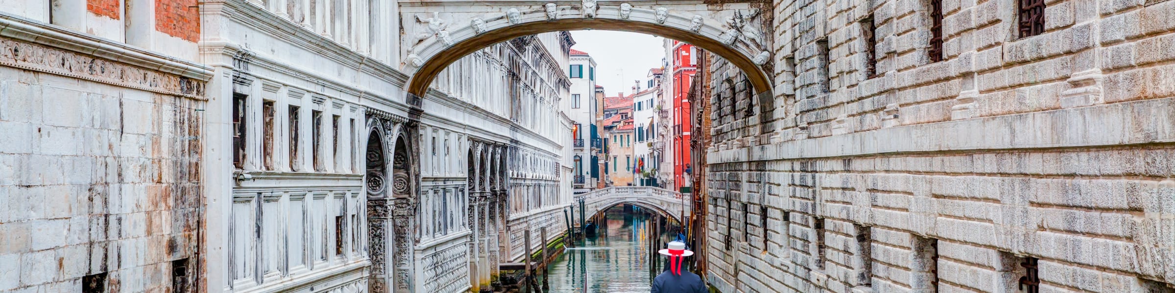As your water taxi glides past narrow side canals and the Canal Grande, you’ll arrive in style at the Rialto Bridge. The iconic stone arch bridge sits at the narrowest point of the Canal Grande and holds numerous shops and restaurants.