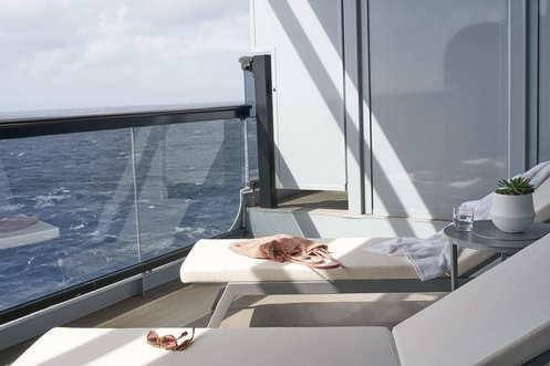 With endless views from the back of the ship whether you're relaxing at the terrace champagne table, or gazing at the waves directly from your indoor Peek-a-Boo shower window, there's no such thing as a bad view in this suite.