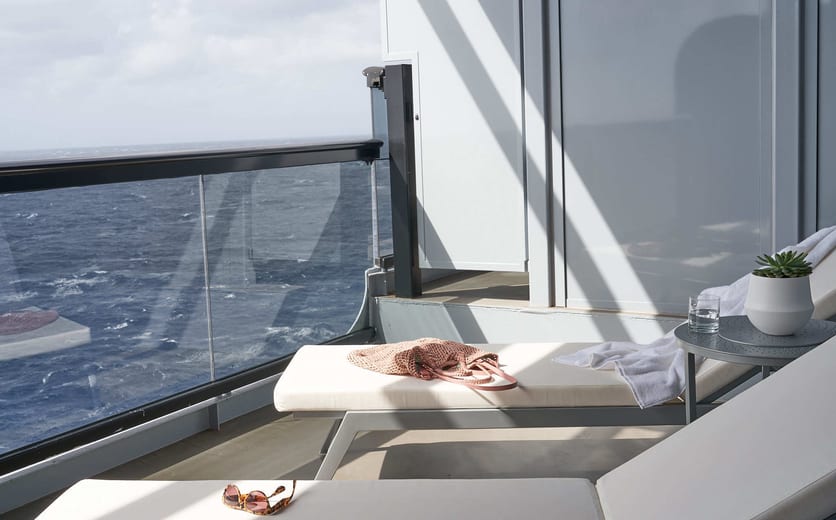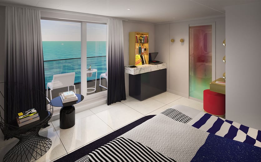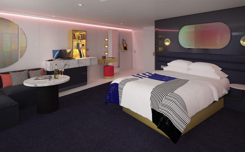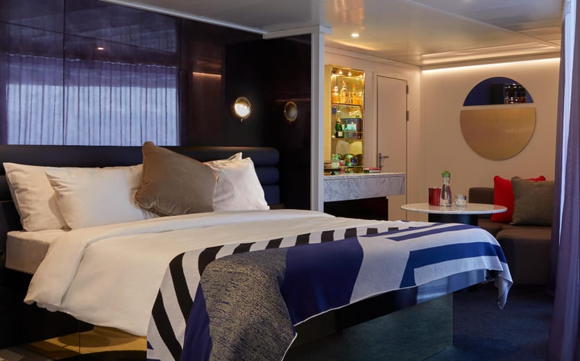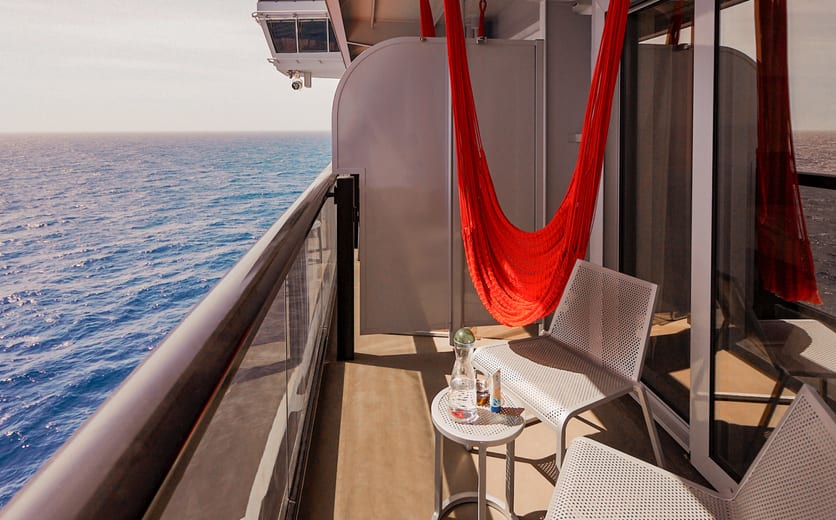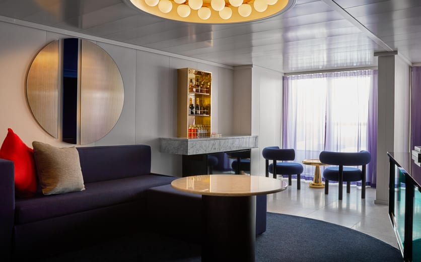 When you're a rockstar — there's no such thing as being "too much" and there's no part of the ship that isn't yours to explore. Our suites are Tom Dixon-designed and equipped with full size, fully stocked bars — so you can sip by the sea whether you're in the terrace hammock or at the champagne table under the stars.