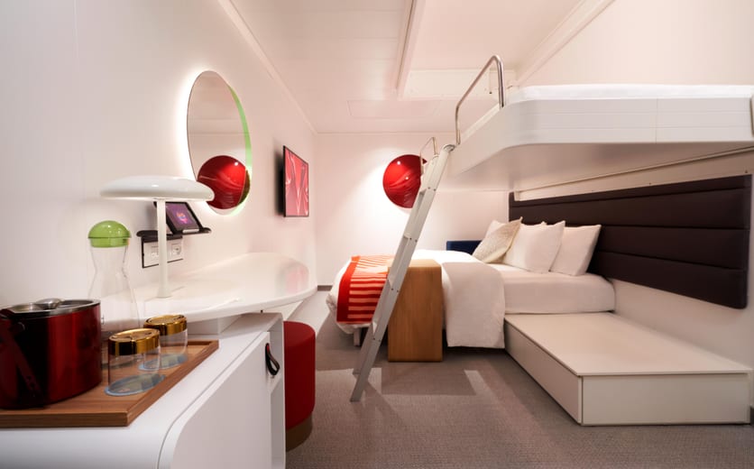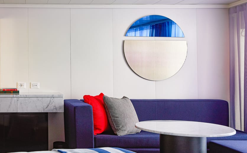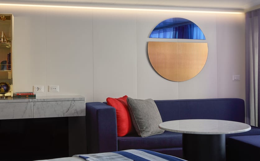 Featuring nautically inspired brass and leather finishings, this sensory and responsive clever cabin has it all from the personal∘ tablet, intuitive mood lighting, music controls, movie streaming, one-touch room service, European queen, transitional Seabed, handwoven terrace hammock and upgraded bathroom experience with a Roomy Rainshower. Sleeps up to three.