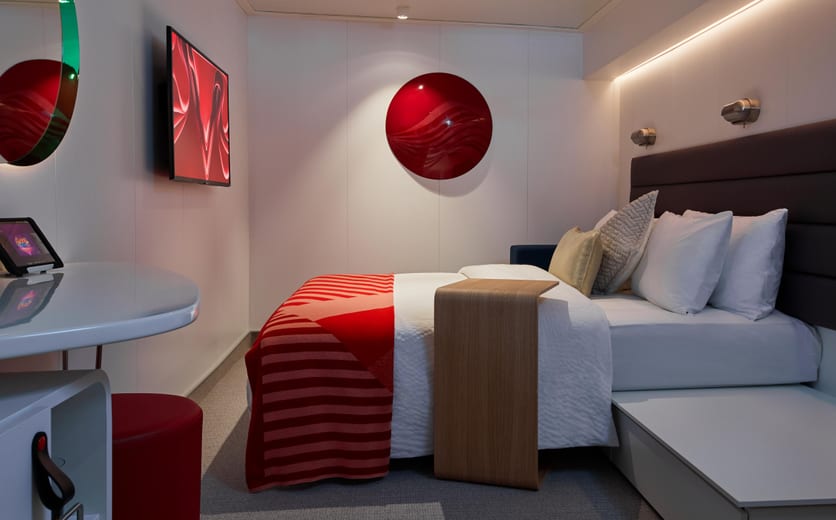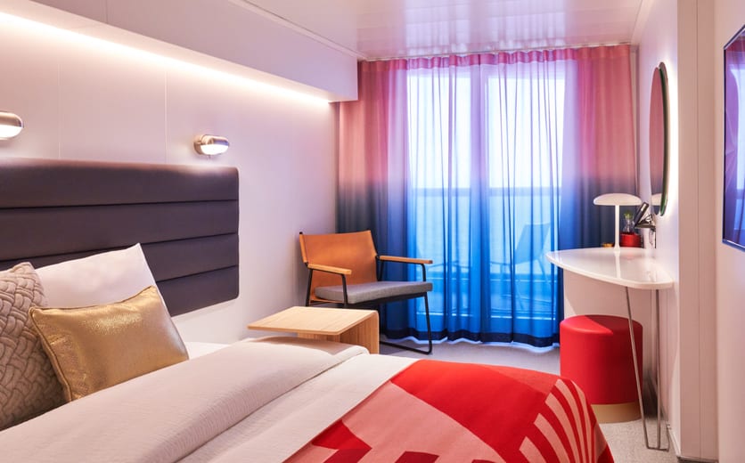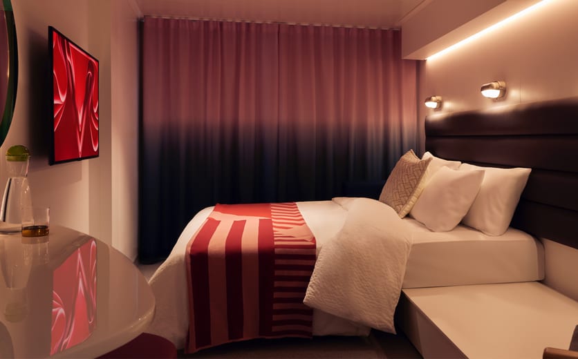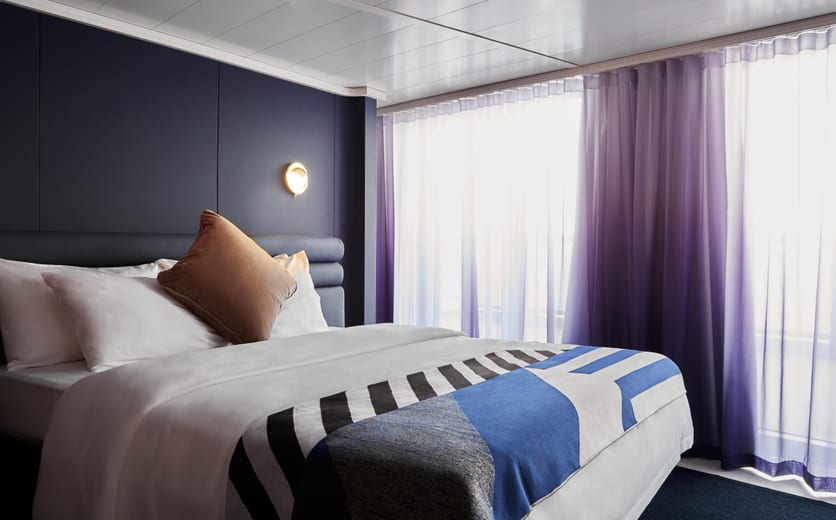 A sensory and responsive clever cabin, nautically inspired brass and leather finishings, a personal tablet, intuitive mood lighting, music controls, movie streaming, one-touch room service and a supremely comfy European queen, transitional Seabed. Plus the large, perfectly partitioned, upgraded walk-in bathroom has enough space for two. Even the Roomier Rainshower boasts just the right amount of space for some “we” time. Sleeps up to three.