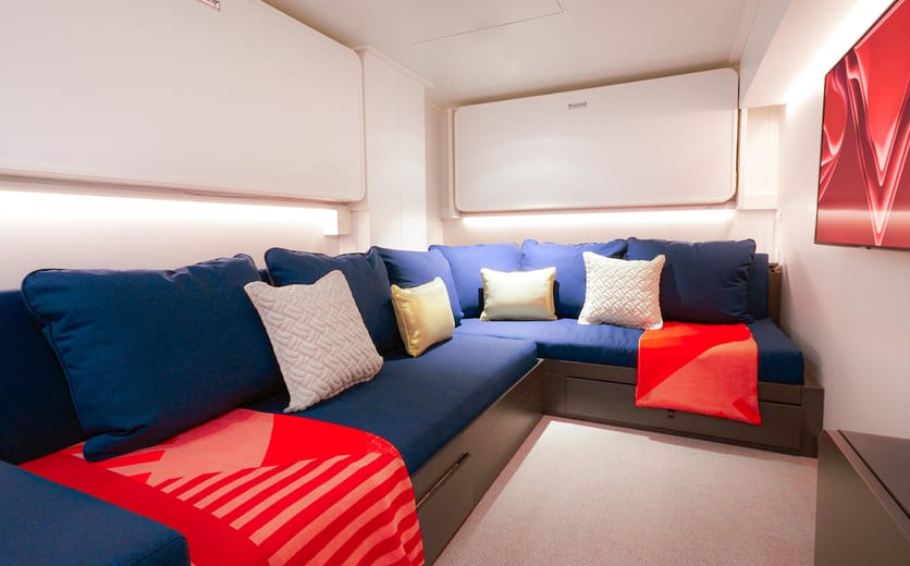 Sailors can crank up the tunes from the record player, serve up some drinks from the fully stocked in-room bar, then take the party to the terrace to enjoy more stunning sea views while relaxing∘ around the Champagne table. Sleeps up to four.