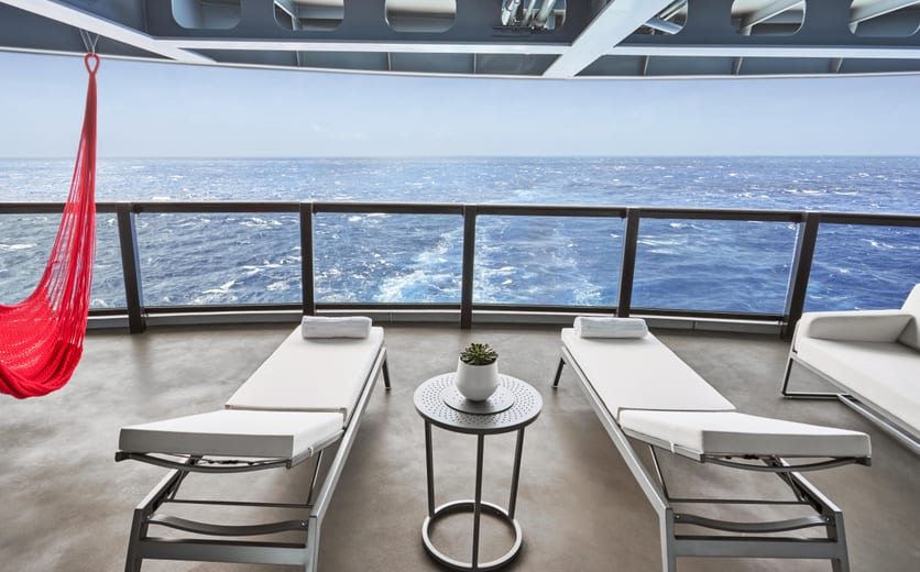 Wrapping panoramic views from the corner of the ship are emphasized by design choices in these suites. Enjoy custom interior carbon fiber chairs on this terrace, meant to maximize sea views - in this case, the wake view. Sailors will gaze at the sea while relaxing near the gorgeous outdoor Champagne table or kicking back in the hand-woven hammock chair.