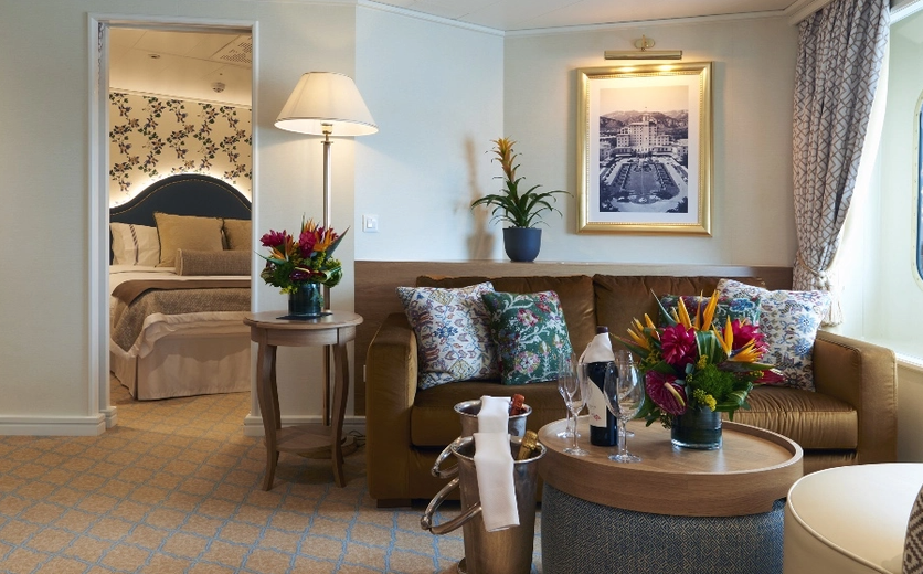 With 376 square feet, you’ll find the perfect space for time together — and plenty of room for time to yourself. You’ll even enjoy two full separate bathrooms. All the amenities of the staterooms await you, plus a beautiful sitting area, and two flat-screen television sets with DVD players.
