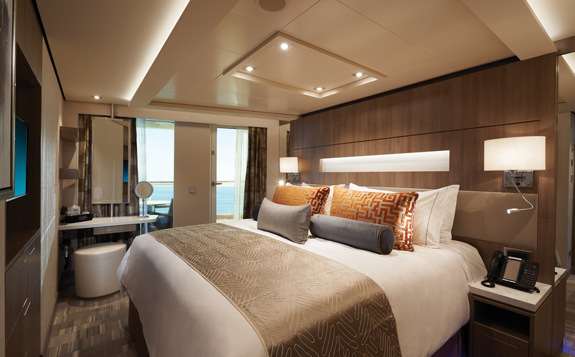 These staterooms include two lower beds that convert to a queen-size bed and are aft-facing, so the view from your private balcony is amazing.