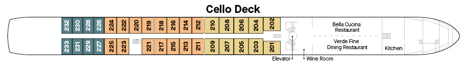 Situated on the Violin Deck the Suite Stateroom offers luxurious accommodation featuring a well appointed ensuite bathroom with shower and bathtub with complimentary spa-quality bath amenities. A comfortable sitting area on the outside balcony. A spacious wardrobe, in room safe and a fully stocked mini-bar within the airy sitting room. Individually controlled air conditioning ensures a calming environment, coupled with, luxurious linens upon the double bed with a french balcony view and robe and slippers to hand for ultimate comfort.