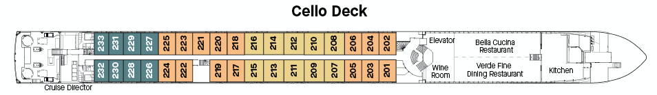 Situated on the Violin & Cello Decks the Suite C Staterooms offer accommodation featuring a well appointed shower room with complimentary spa-quality bath amenities. A spacious wardrobe and in room safe and individually controlled air conditioning ensuring a calming environment, coupled with, luxurious linens upon the double bed with a french balcony view and robe and slippers to hand for ultimate comfort.