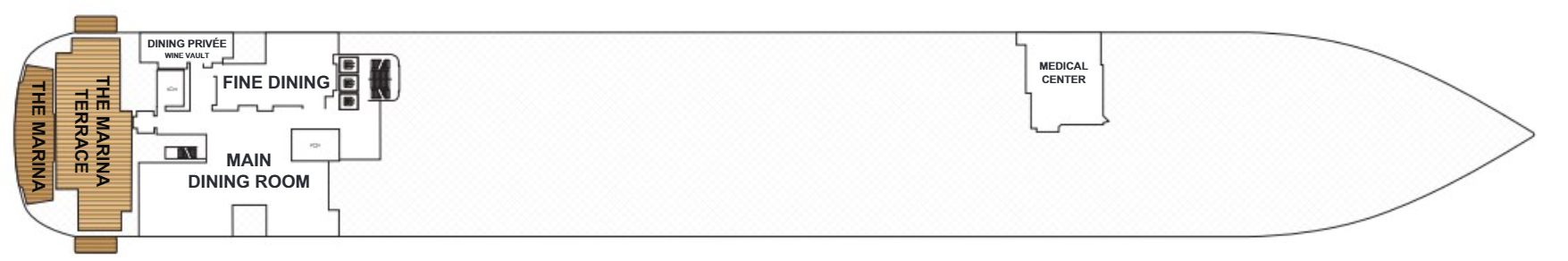 The welcoming entry corridor of the Signature Suite leads to an intimate dining area for two, where you can enjoy a delicious meal at any time of day or night. Then take in a movie from the plush sofa in the living area, or from the custom king bed in the spacious bedroom that features a second television. The bath offers the convenience of a double vanity for couples, a walk-in shower and a soaking tub, perfect for unwinding after adventures ashore. The ample 409 square feet of interior space is complemented by a private outdoor terrace of up to 151 square feet, where a comfortable lounger is equally suited to sunbathing or stargazing.