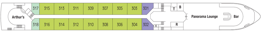 Two floor-to-ceiling French Balconies, each 98 inches wide x 75 inches high each with one sliding door that opens, Quad cabin made possible by pullout couch (only for children), Coffee maker plus mini-bar stocked with complimentary water and soft drinks replenished daily, 32" LED TV, Breakfast room service, Iron plus ironing board, 220v and 110v outlets in cabin and bathroom, Easy under-bed luggage storage, Telephone, safe and individual climate control, Onboard wi-fi available, a shipboard credit (one per stateroom) is provided to be used onboard for spa services, gift shop purchases, etc