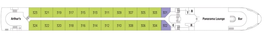 Innovatively designed 225 sq. ft. "split-level" loft cabins, One-and-a-half deck window that opens at the top, electronically controlled, Loft sitting area, Safe, Minibar stocked with complimentary water and soft drinks, replenished daily, 32" LED TV , Window (98 inches x 114 inches) can be partially opened, 220v and 110v outlets in cabin and bathroom, Easy under-bed luggage storage, Telephone and individual climate control, Onboard wi-fi available