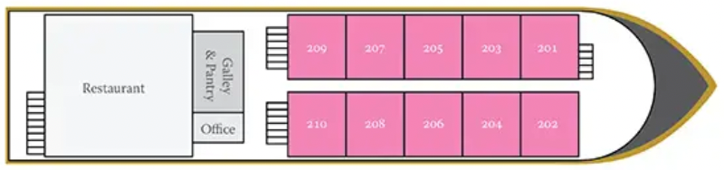 The RV Ganges Voyager offers more than just a trip. This superb ship offers a unique cruise in old-fashioned luxury and a British colonial atmosphere. The perfect match for discovering the Indian continent, its history, its ancient culture and its welcoming people. Built in 2014, the RV Ganges Voyager is a magnificent intimate-sized Premium ship that sails on the Ganges, the sacred river of ancient India. It is 56,50 meters long and 12,50 meters wide. It can accommodate 56 passengers, in 28 cabins spread over 3 decks. The size of each cabin (or suite) is between 24 m2 to 37 m2, offers amenities and provides guests with all the comforts they need during their stay. The decoration of the ship is stylish and its atmosphere in perfect harmony with its surroundings. The precious fabrics and fine materials give it a particularly refined dimension. The restaurant, which offers a delicate cuisine in beautiful surroundings, is located on the main deck. Large windows allow guests to admire the splendid landscapes. Situated on the sun deck is the lounge / bar, a small sports room, a yoga area and a spa.