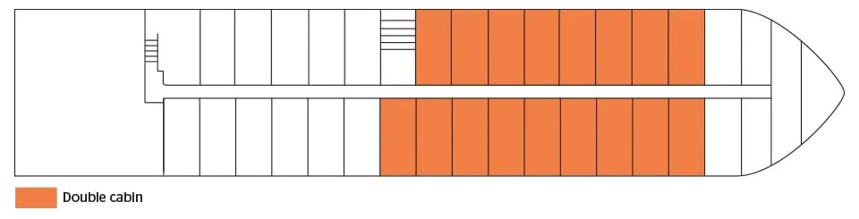 Each cabin has a size of 14,5m² - 16 m²(plus 2 suites of 22 m² each), offers amenities and provides guests with all the comforts they need during their stay. The decoration is stylish and its atmosphere, both elegant and friendly, is in perfect harmony with its surroundings.