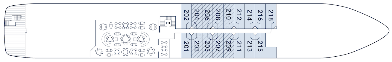 Enjoy 375 sq. ft. / 34.8 sq. meters of living space with ocean views from a total of 3 picture windows. Partitioned living and dining areas with ½ guest bath and closet. Separate and private en-suite master bedroom with permanent queen bed and closet. Marble-lined bathroom with multi-jet shower and soaking tub. Built-in dresser with writing desk. The Admiral Suite is Suite 400 on both yachts and is near the Library.