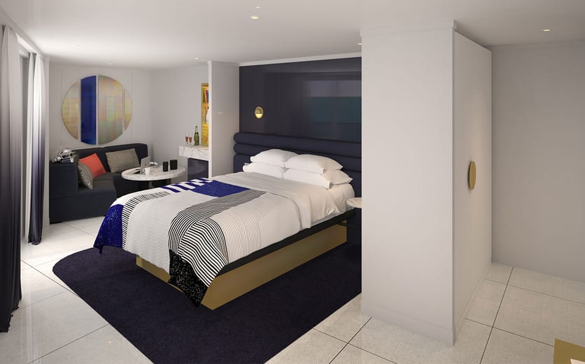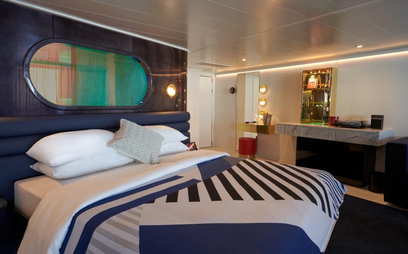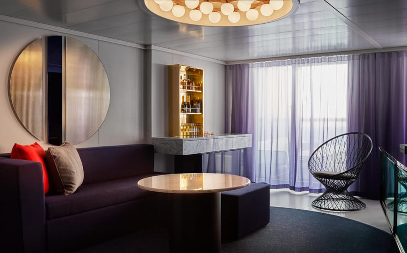When you're a rockstar — there's no such thing as being "too much" and there's no part of the ship that isn't yours to explore. Our suites are Tom Dixon-designed and equipped with full size, fully stocked bars — so you can sip by the sea whether you're in the terrace hammock or at the champagne table under the stars.