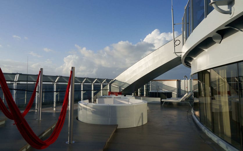 Wrapping panoramic views from the corner of the ship are emphasized by design choices in these suites. Enjoy custom interior carbon fiber chairs on this terrace, meant to maximize sea views - in this case, the wake view. Sailors will gaze at the sea while relaxing near the gorgeous outdoor Champagne table or kicking back in the hand-woven hammock chair.