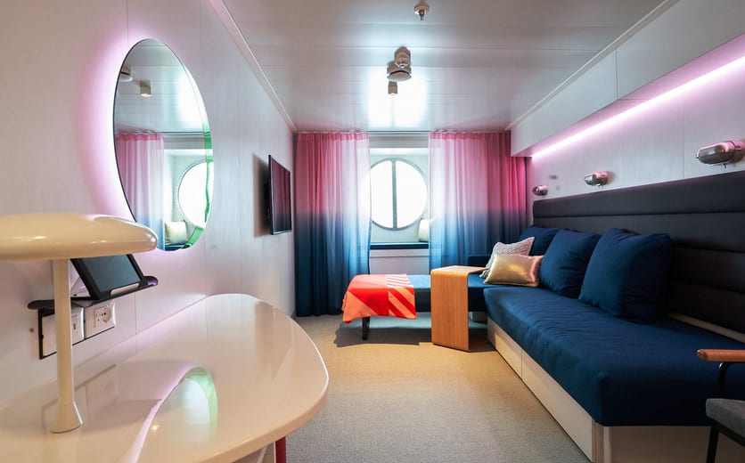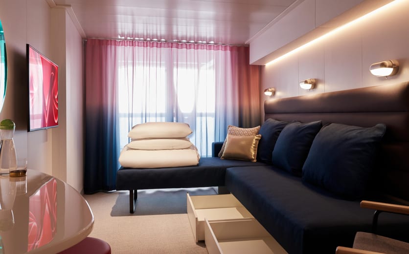 A sensory and responsive clever cabin, nautically inspired brass and leather finishings, a personal tablet, intuitive mood lighting, music controls, movie streaming, one-touch room service and a supremely comfy European queen, transitional Seabed. Plus the large, perfectly partitioned, upgraded walk-in bathroom has enough space for two. Even the Roomier Rainshower boasts just the right amount of space for some “we” time. Sleeps up to three.
