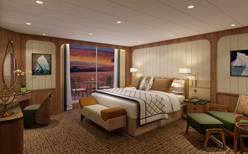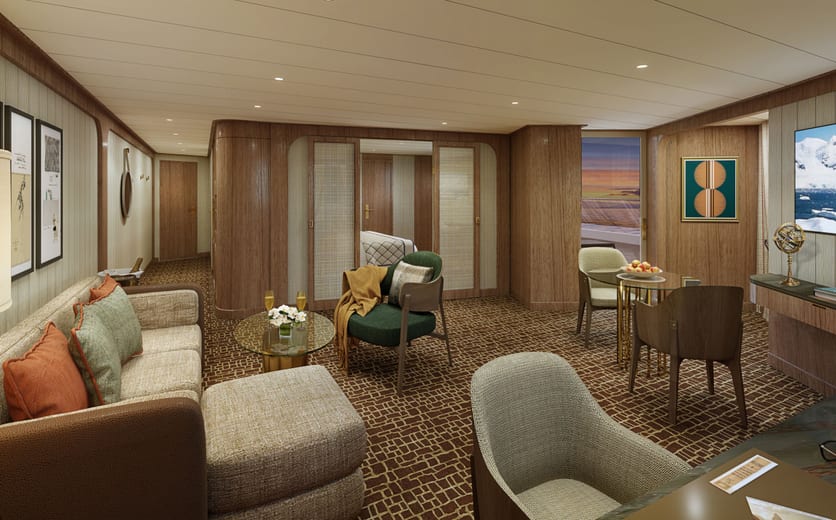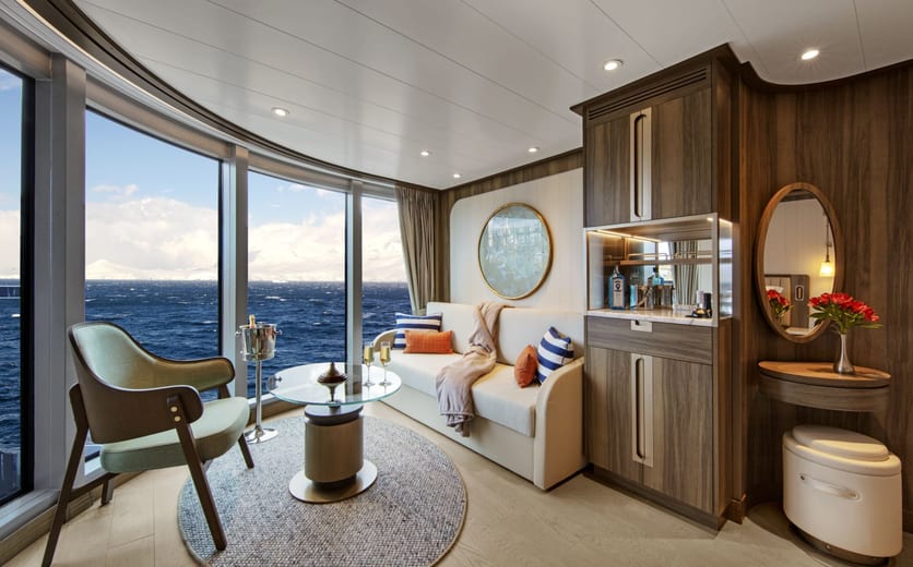 Owner's Suites on Seabourn Venture feature a comfortable living area; private veranda; queen-size bed or two twin beds; extra-large walk-in closet for expedition gear; personal safe; interactive flat-screen TV with music and movies; fully stocked bar and refrigerator; writing desk with personalised stationery; makeup vanity; spacious bathroom with double vanities, tub and shower, plush robes, slippers, hairdryer and 110/220V AC outlets.